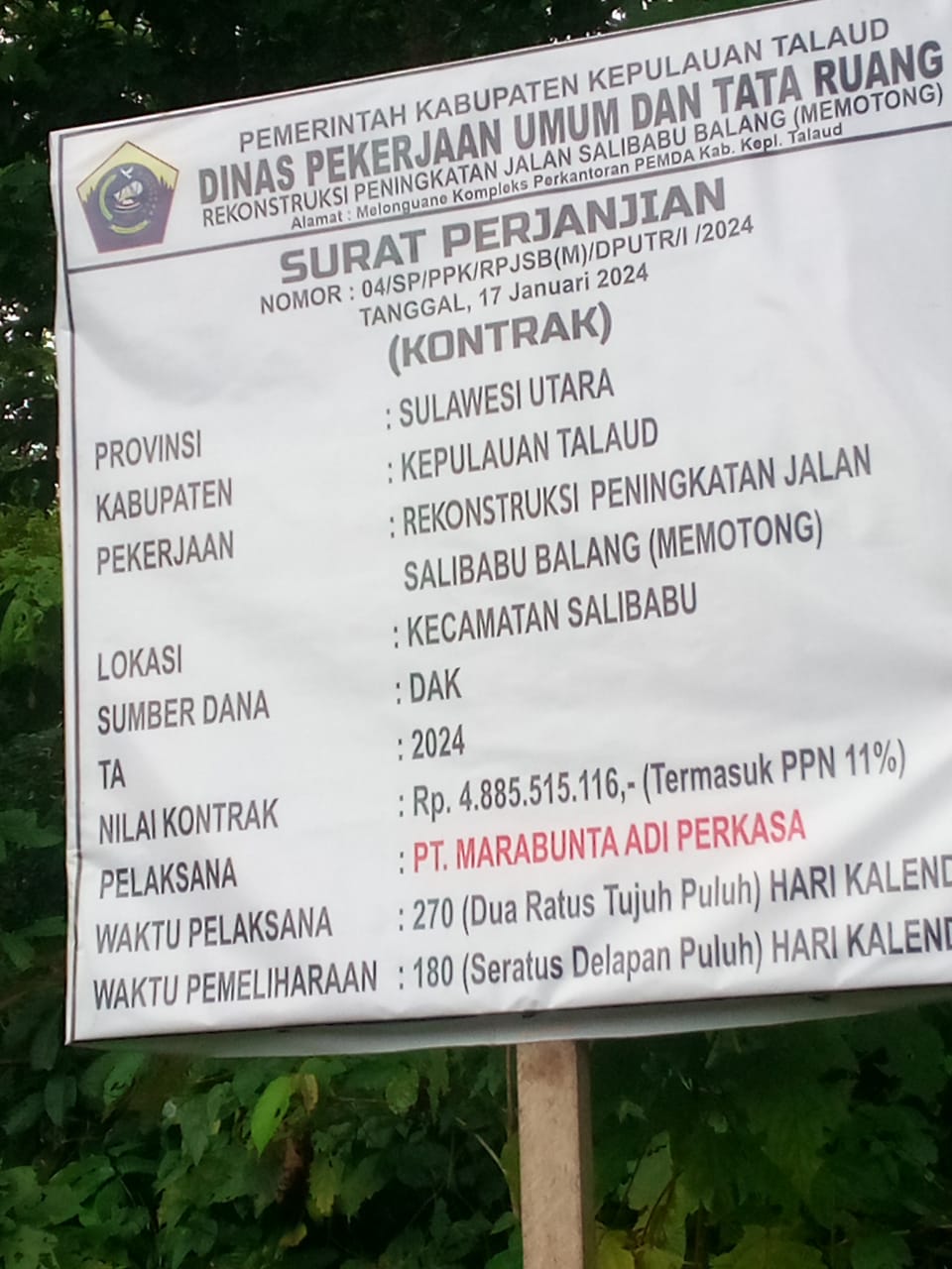 Pekerjaan Rekonstruksi Peningkatan Jalan Salibabu Balang, Pelaksana PT. Marabunta Adi Perkasa di dasarkan pada Surat Perjanjian Nomor: 04/SP/PPK/RPJSB(M)/DPUTR/I/2024. Tanggal, 17 Januari 2024.